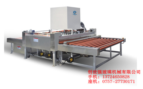 包括不銹鋼殼體、傳送輪、膠輥、毛刷、傳送支架、電控箱,不銹鋼殼體的側(cè)面玻璃入口處設(shè)有引輪,傳送支架上設(shè)有若干靠輪,傳送支架的下部設(shè)有并行排列且通過(guò)若干聯(lián)動(dòng)片銜接的若干組傳送輪,玻璃清洗機(jī)內(nèi)腔的另一側(cè)設(shè)有膠輥,膠輥的左側(cè)設(shè)有若干毛刷,靠近玻璃出口處設(shè)有風(fēng)口。避免了二次清洗,有效的提高了產(chǎn)品清洗的工作效率;采用觸摸顯示屏操作系統(tǒng),并可隨時(shí)監(jiān)測(cè)設(shè)備運(yùn)行和隨時(shí)監(jiān)測(cè)設(shè)備故障;設(shè)備安裝調(diào)試快速、便捷,清洗機(jī)主體結(jié)構(gòu)和內(nèi)部采用不銹鋼材料;減少電耗。