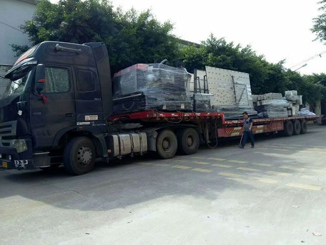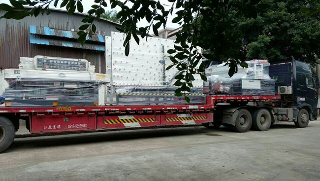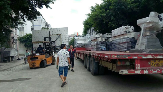 創(chuàng)世強(qiáng)自研制造的玻璃直線磨邊機(jī)4臺(tái)翻轉(zhuǎn)機(jī)3臺(tái)打砂機(jī)一臺(tái)鉆孔機(jī)2臺(tái)異形機(jī)1臺(tái),裝滿長(zhǎng)長(zhǎng)一貨車,發(fā)往廣西梧州